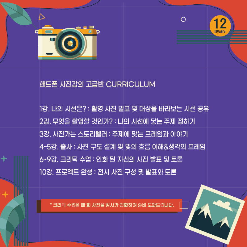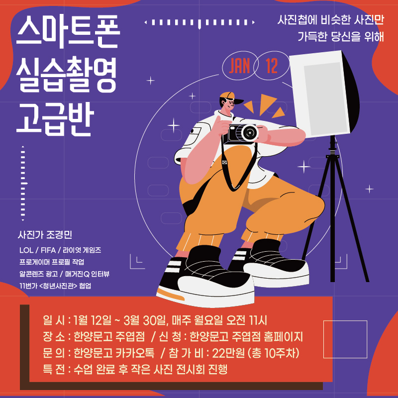 사진첩에 비슷한 사진만 가득하고, 늘지 않는 사진실력에 답답함을 느끼시는 분들을 대상으로 핸드폰 촬영 고급반을 열어 알려드립니다.