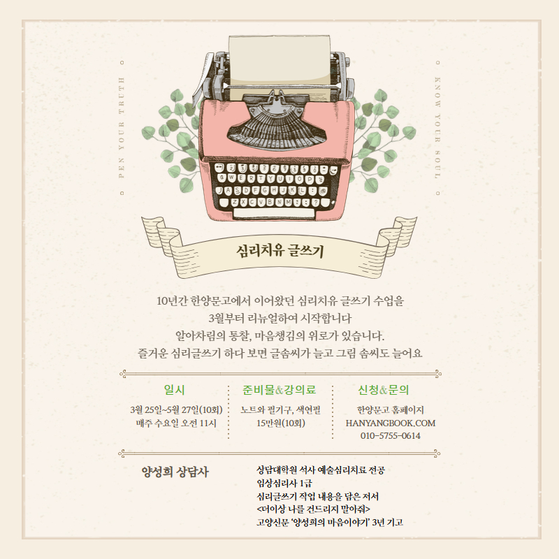 10년간 한양문고에서 이어왔던 심리치유 글쓰기 수업을 3월부터 리뉴얼 하여 시작합니다.